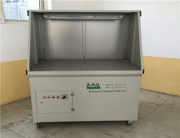 打磨除尘工作台三面采用包围式对粉尘进行有效控制,台面为吸尘口将粉尘抽入到净化主机内部,高精度过滤等技术,适用于金属热加工产生的烟气粉尘治理,通过高压静电设备在烟尘废气的产生源头进行有效收集,及时阻止烟尘废气的挥发扩散,保持车间空气清洁。被吸收的烟尘废气通过精度高达0.3μm的有效滤芯过滤净化后,经过滤单元过滤干净的空气直接排放在集尘室内。定期清理粉尘收集盒即可。被过滤掉的粉尘收集在积灰槽内,防治二次污染,同时对贵重金属物料起到回收作用。