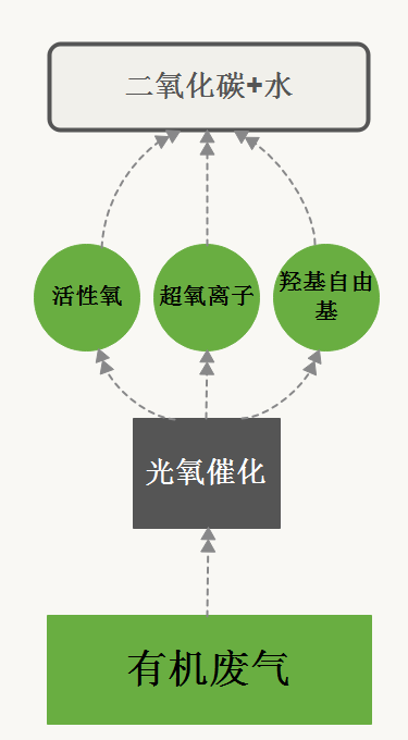 利用高能高臭氧UV紫外线光束分解空气中的氧分子产生游离氧,即活性氧,因游离氧所携正负电子不平衡所以需与氧分子结合,进而产生臭氧。之后通过臭氧发生器制造足够的氧离子对废气进行氧化,达到让废气生成二氧化碳和水的效果。