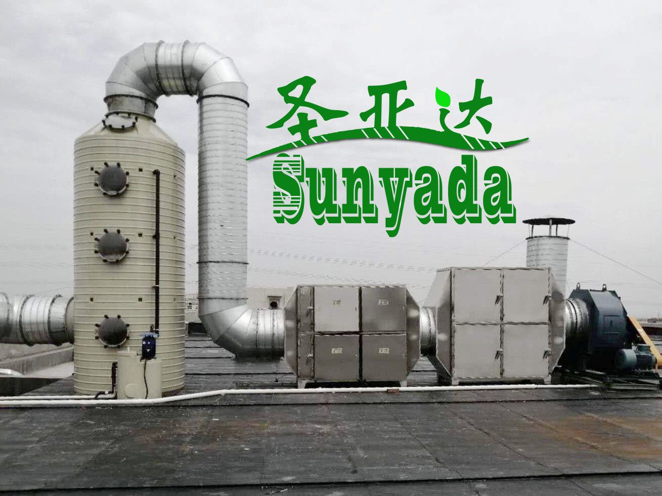 此种工艺适用于喷漆,化工等行业,针对含尘及其他酸碱废气先用喷淋塔进行吸收,然后进行除雾净化,经过喷淋塔净化后的废气在经过活性炭吸附装置完成净化。