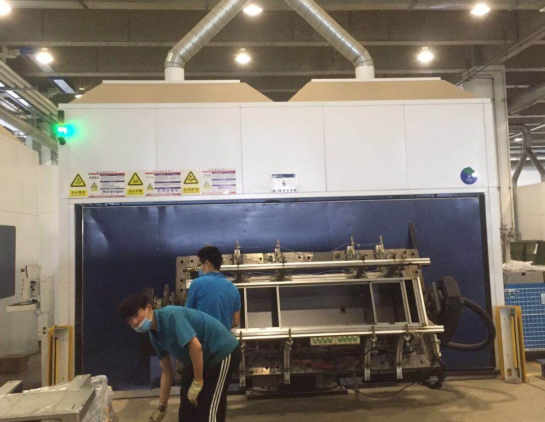 第二种,就是在焊接机器人上方设置顶吸罩可移动式顶吸罩。顶吸罩在焊接机器人焊烟收集的应用中较为普遍的,像我们之前为广东某客户定制的机器人焊接除尘方案,就是采用这种方式。我们结合客户工况及机器人路径设计顶吸罩的尺寸大小,为其设计研发了此款机器人焊接除尘设备。该款设备采用四周悬挂防护软帘设计,能有效防止焊接飞溅,其可悬吊在天花板上或安装在可移动的机器人龙门架上,能为工厂设计提供了大量空间。