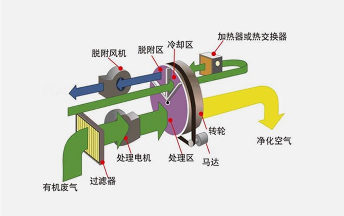 再生后的吸附剂先经过冷却区降温,然后转动到吸附区重新进行吸附。随着转轮的转动吸附剂周期性地进行吸附、脱附和冷却,实现对有机废气的净化。